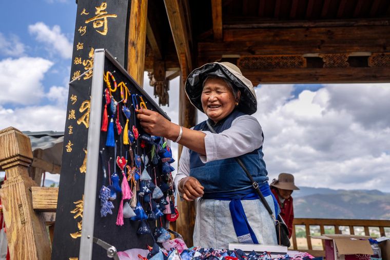 云南省大理州沙溪镇华龙村的白族老人何先会在整理制作好的手工刺绣香囊(4月20日摄)。新华社记者 刘莲芬 摄
