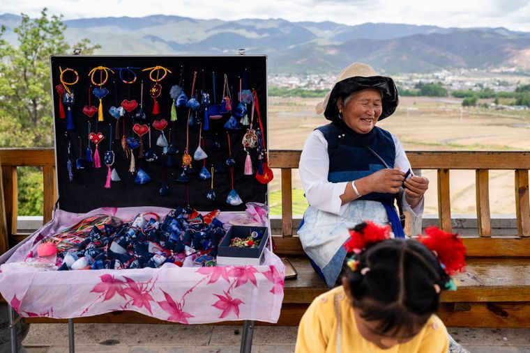 白族老人闲暇时做的手工刺绣
