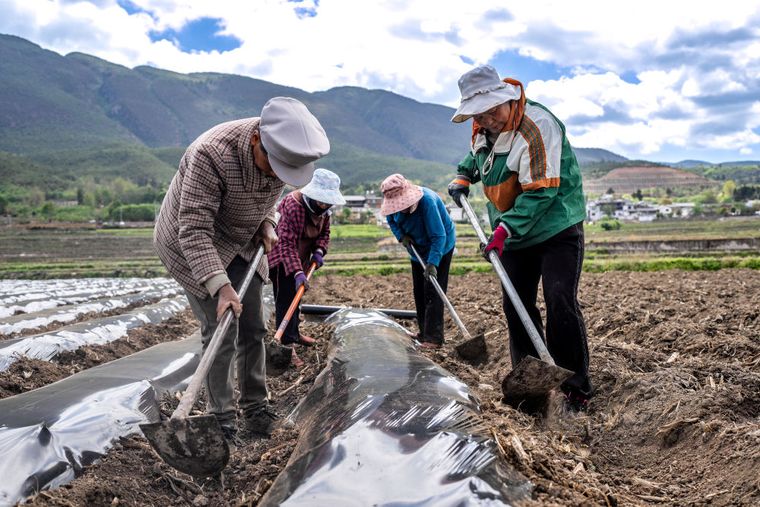 云南省大理州沙溪镇北龙村村民在田里干农活(4月20日摄)。新华社记者刘莲芬 摄