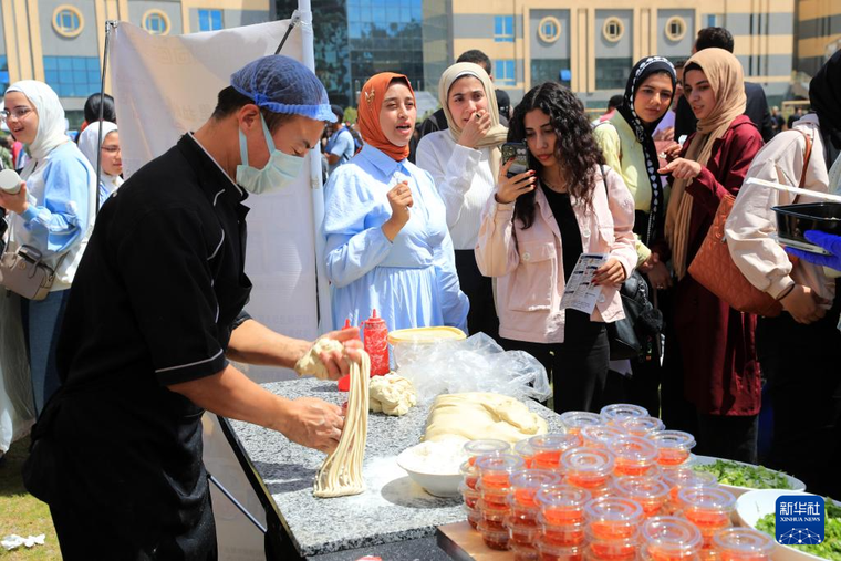 4月27日,学生在埃及开罗举行的“国际中文日”活动上观看拉面制作。 新华社记者 隋先凯 摄