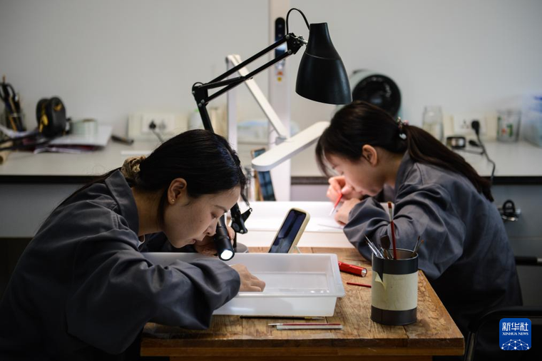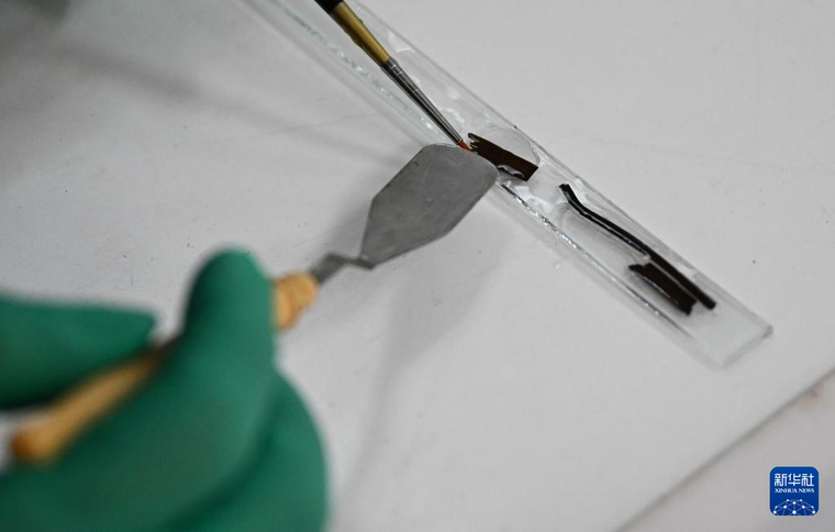 4月24日,荆州文物保护中心简牍工作室工作人员在处理竹简残片。 新华社记者 程敏 摄