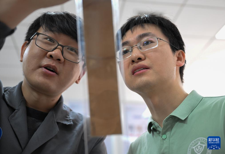 4月24日,在荆州文物保护中心简牍工作室,清华大学出土文献研究与保护中心副教授魏栋(右)查看牍片上的文字。 新华社记者 程敏 摄