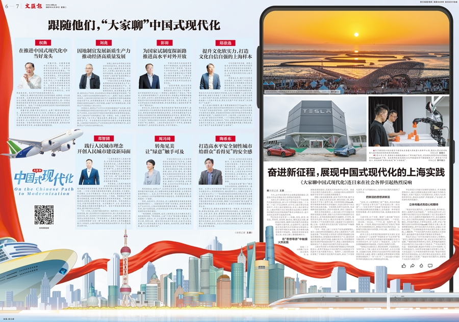 “推进中国式现代化,上海率先垂范,勇当标兵,感受上海现代化系列成果。”一位网友这样点评。《大家聊中国式现代化》系列短视频于文汇报全媒体平台首发,本市主流媒体所属新媒体平台、各区融媒体中心、东方卫视等电视频道、各商业网站及平台同步播出,并向海外推送。许多网友转发、点赞、评论:“很期待这场专家带队的Citywalk!用脚步丈量上海,借案例解读理论,把中国式现代化具象化,定能让大家收获满满。”“专家娓娓道来中国式现代化的上海实践,心潮澎湃。”“中国式现代化的壮美画卷正在徐徐展开,越来越多具象化的细节展现在世界面前。”