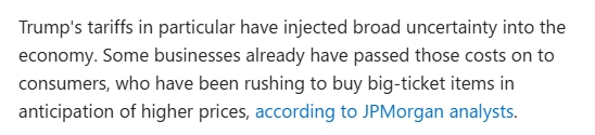 商界领袖们迫切希望美国的政策能有几周的稳定,美国农户们发现自己的联邦食品补贴合同已经终止,全美各地的非营利组织都在裁员,因为白宫正在削减开支。尤其是特朗普政府的关税政策给经济带来了广泛的不确定性。摩根大通分析师表示,一些企业已经将这些成本转嫁给了消费者,消费者因预期价格上涨而抢购大件商品。
