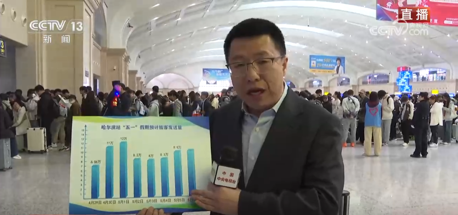 记者来到哈尔滨站候车大厅的一处检票口,可以看到很多旅客正在排队等候检票上车。为了应对大客流,哈尔滨站有14个检票口、100多个检票闸机全部开放,根据不同车次进行动态调控,保证旅客能够快速进出站。据铁路部门最新数据,1日,哈尔滨站预计发送旅客12万人次。从图表上就能看到,从4月29日假期运输首日开始算起,29日达到6.86万人次,30日达到11万人次,显示出攀升态势。到了假期中间,旅客数量将会有所下降,假期快要结束的时候,旅客数量又将会明显增加,呈现出“两头高,中间低”的特点。为此,哈尔滨铁路部门根据12306预售票数据科学安排运力,加开了北京、大连等方向临客列车71.5对。同时,还将适时开行夜间高铁,最晚一班在0时40分发车,方便广大旅客出行。