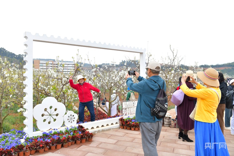 游客在梨花节打卡拍照(央广网发 杨淼茹 摄)