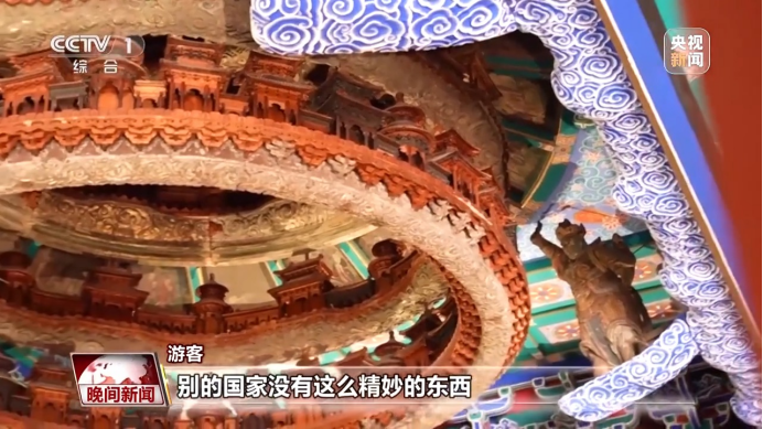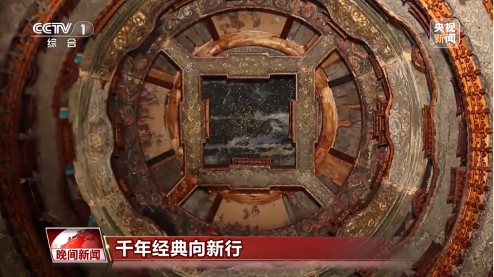 总台记者 罗子瑛:我头顶的这座直径两米的六层藻井,支撑起的是一片五百多年前绘制的唐代星空。这是先农坛的镇馆之宝,很多人来到这里,都是为了看一眼这座天花板中的“天花板”。而我们目之所及的琼楼玉宇和精工细作,都是由榫卯构建的。
