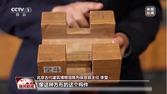 北京古代建筑博物馆陈列保管部主任 李莹:我们现在看到的实际上就是一个清代官式的三彩斗拱的构件,像方形的这个构件,我们管它叫作斗,然后像弓形的构件,我们管它叫作拱,实际上,斗和拱就是通过榫卯一层一层,层叠而成的。