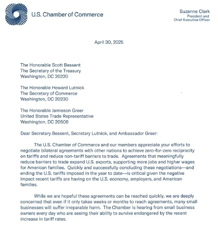 克拉克在4月30日晚间发给财政部长贝森特、商务部长卢特尼克和美国贸易代表格里尔的信中写道:“我们深感担忧,哪怕只需数周或数月就能达成协议,许多小企业也将遭受无法弥补的损害。”
