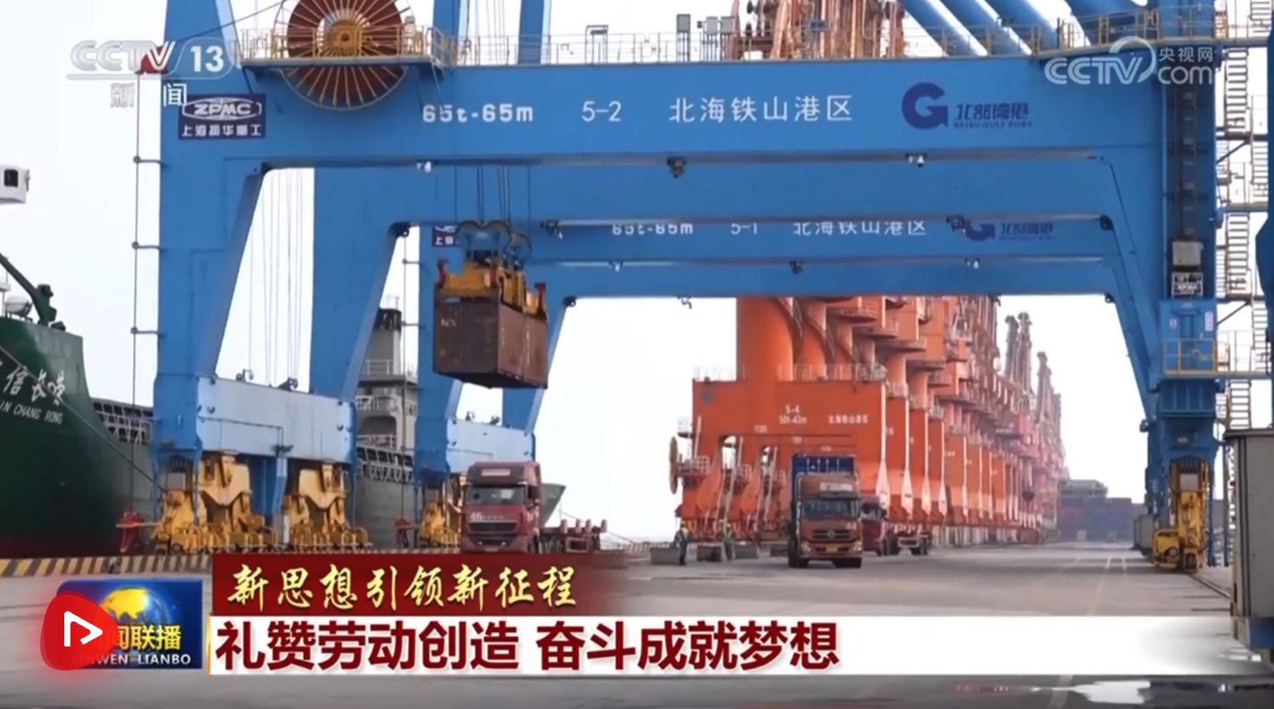 在广西北海,铁山港岸桥林立,货轮有序装卸,货车往来穿梭,来自世界各地的货物在这里高效畅通中转。