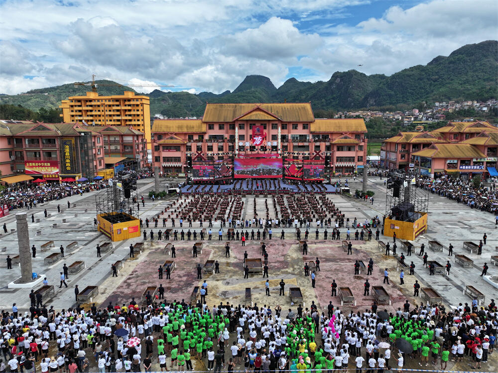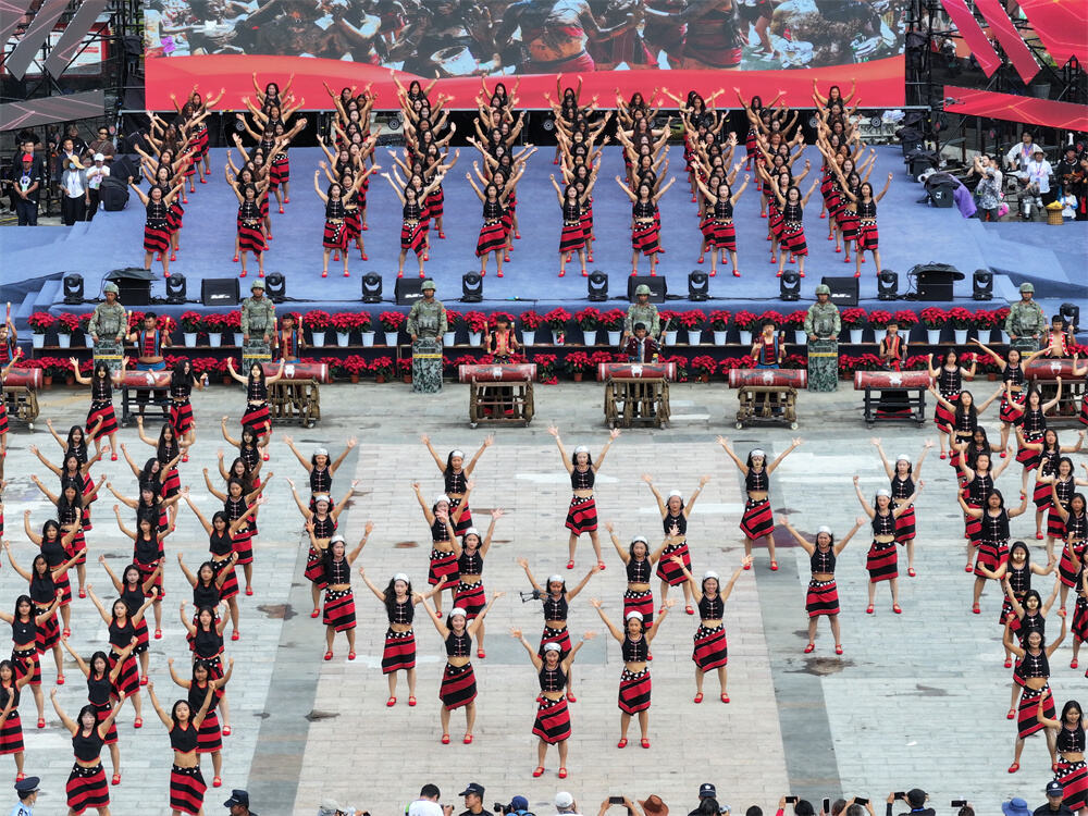 木鼓率先敲响狂欢的序曲。在广场中央,上百台木鼓列阵如林,在古铜色臂膀的撞击下发出浑厚轰鸣,百台木鼓同时擂响,声浪如滚雷般掠过勐董河畔,震颤山谷。当木鼓声攀至顶峰,千名佤族少女从四面涌入广场中央。她们黑瀑般的长发随着鼓声响起,整齐划一地甩向天际,整个表演原始古朴、粗犷豪放、震撼人心、激情飞扬,给现场观众带来了一场极致的视听盛宴。游客们的手机、相机追逐着这流动的黑色绸缎,快门声和惊叹声交织成盛大和声。