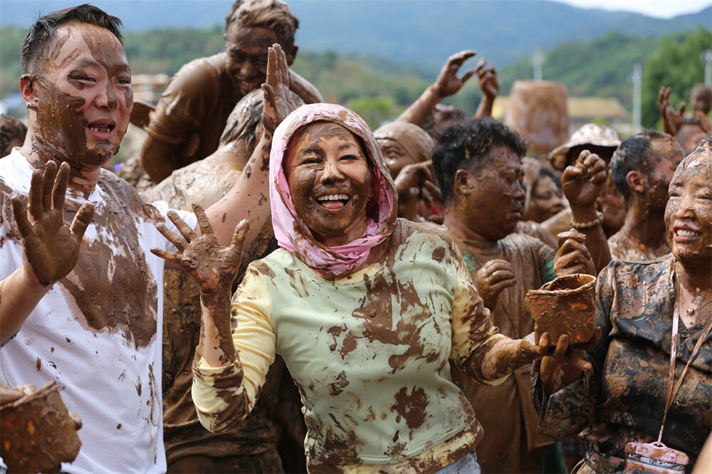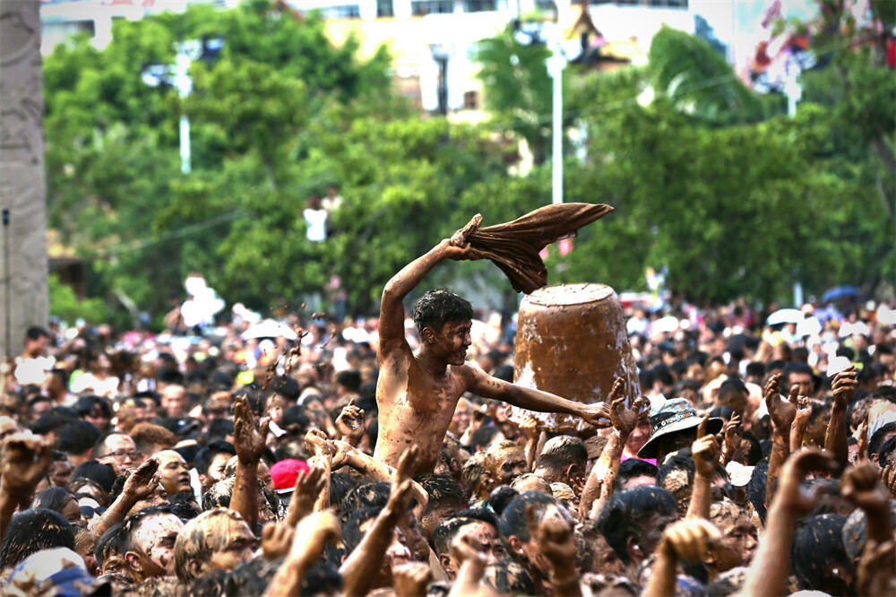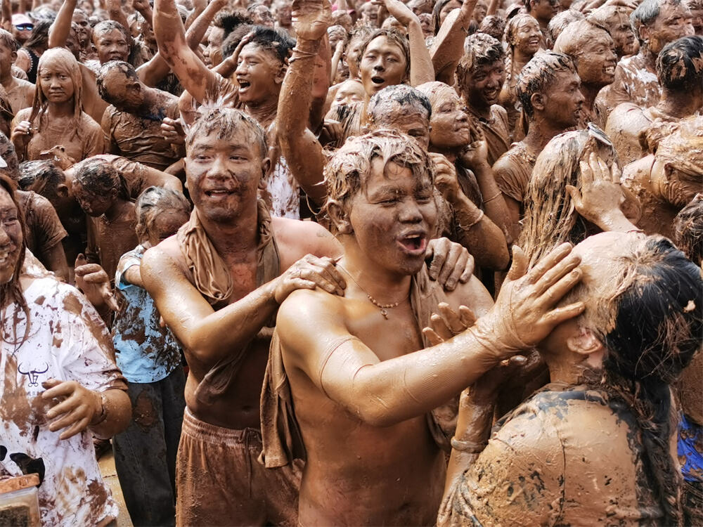 “一起来”“向左”“向左”……舞台上的DJ播放着动感十足的音乐,人群随着音乐舞动起来。泥点飞溅间,身份、年龄、民族的界限被彻底打破,泥浆磨平了浮躁和烦恼,只剩快乐在整个广场上空飘扬。