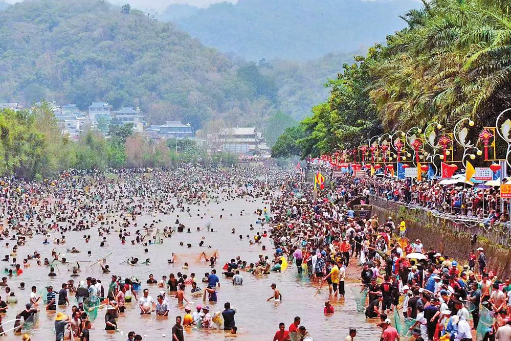 神鱼节作为孟连独具特色的传统节日,被誉为“东方水上狂欢节”。活动当天,南垒河娜允大桥至橡胶大坝河段早早便聚集了大批热情高涨的“捉鱼大军”,随着一声令下,人们手持渔网、网兜、竹笼等捉鱼工具,迫不及待地涌入河中,呐喊声、欢笑声此起彼伏,热闹非凡。下水约1小时,来自孟连的岩罕班就捉住了当天最大的鱼王。“每年都参加捉鱼狂欢,去年拿了二等奖,今年拿了一等奖,收获不错。”岩罕班说,当晚会约亲朋好友一起享用捉到的鱼。