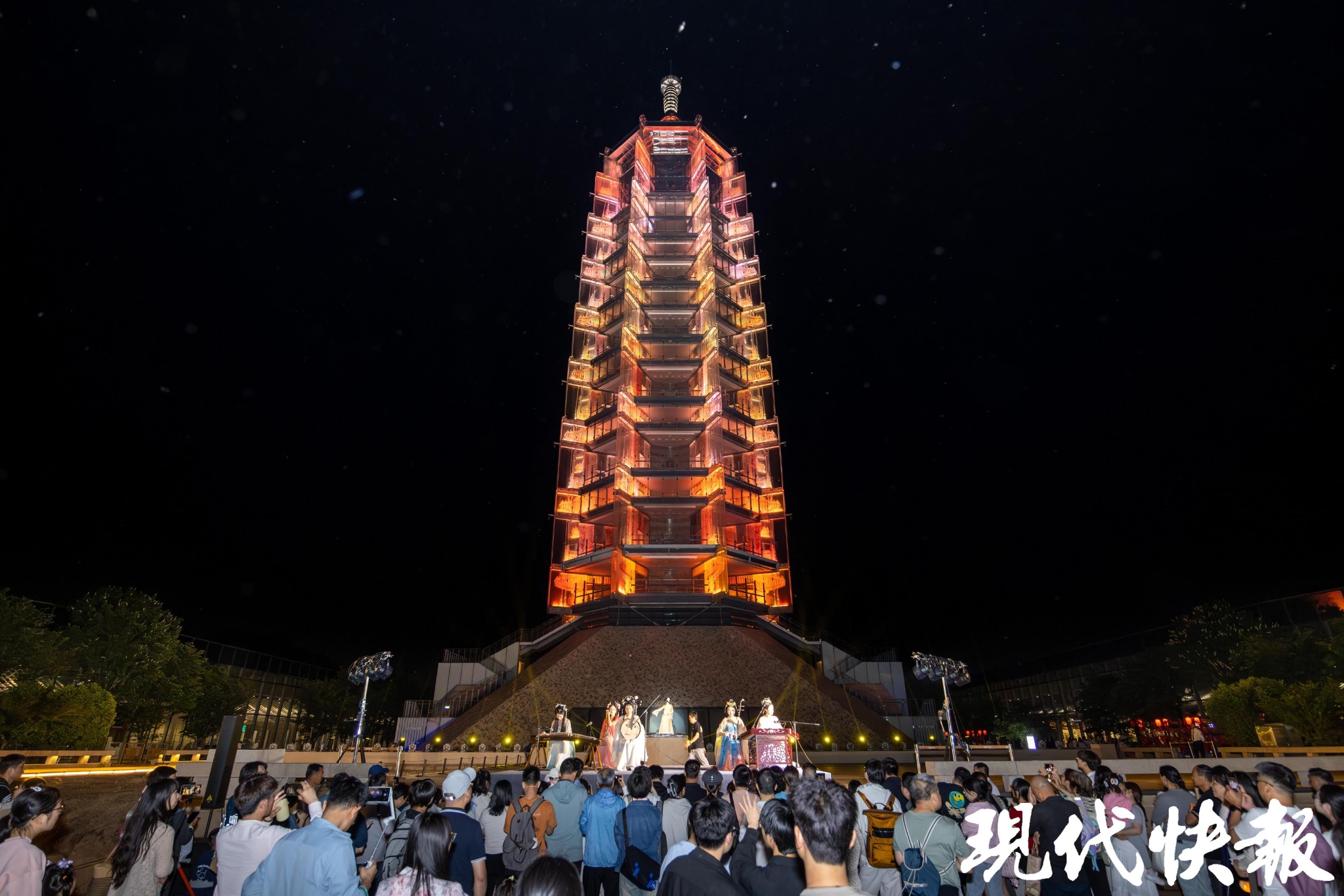 大报恩寺的“灯塔音乐会”科技含量很高:夜幕降临,城市灯塔下再次奏响,一曲曲国风主题乐率先拉开点灯仪式的序曲,通过塔身灯光秀,将历史意象转化为“光之史诗”。如果身临其境,这种感受是非常奇特的,它有这种夜访遗址的怀古探幽,又有听一场音乐会的治愈温暖,同时还能在声光中感知“古今同辉”的震撼……