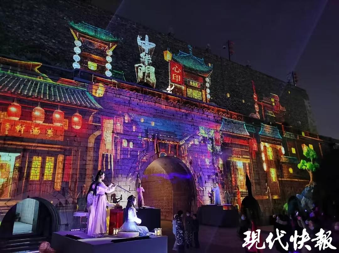瞻园内,戏韵的婉转唱腔与光影交织;大报恩寺遗址的琉璃塔下,古乐与星辉斑斓共舞;明城墙上,千年砖石在光雕中重现盛世画卷……