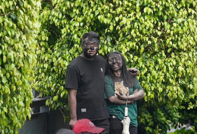 这是5月2日在墨江拍摄的参加“抹黑脸”狂欢的两名游客。新华社记者 陈欣波 摄