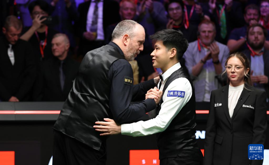 5月5日,赵心童(左二)在比赛后与威廉姆斯相互致意。新华社发(翟政摄)