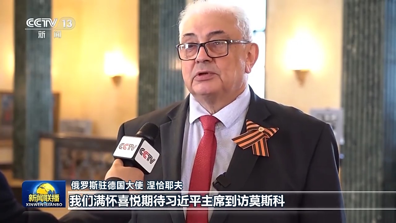 俄罗斯驻德国大使 涅恰耶夫:我们满怀喜悦期待习近平主席到访莫斯科。苏联人民和中国人民在二战中付出了巨大牺牲,最终赢得世界反法西斯战争胜利。习主席曾引用俄历史学家克柳切夫斯基的话说,如果丧失对历史的记忆,我们的心灵就会在黑暗中迷失,我认为习主席观点非常正确。每个国家、每个民族都必须了解历史,没有历史就没有真正的未来,我对两国人民拥有良好的关系和美好的未来充满希望。