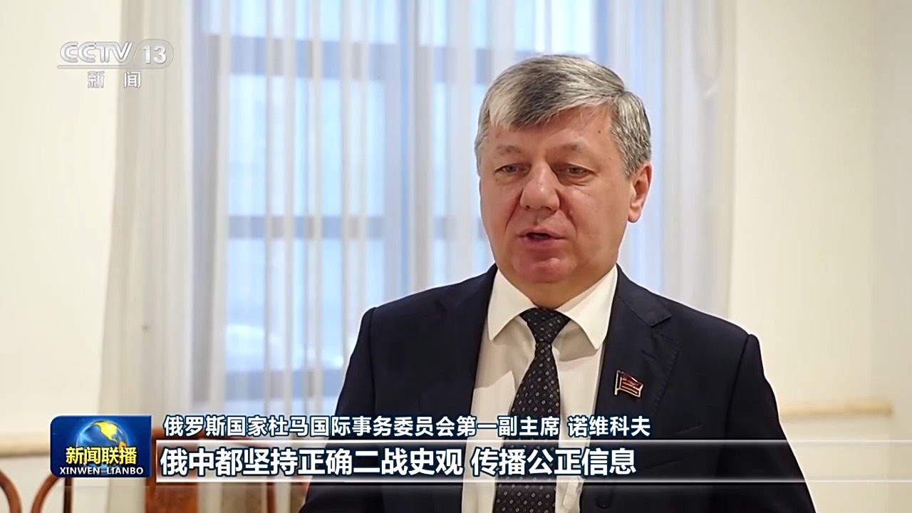 俄罗斯国家杜马国际事务委员会第一副主席 诺维科夫:关于历史观,习主席有一系列重要论述,铭记历史,和平才有希望。俄中都坚持正确二战史观,传播公正信息,两国领导人致力于推动建立更加平等和多极化的世界,构建人类命运共同体理念在全球获得广泛认同。我认为在伟大卫国战争胜利80周年的重要时刻,习近平主席来到莫斯科,对深化两国关系、对全球都有重大意义。