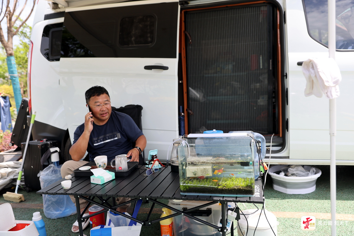 黑龙江佳木斯的牟彦峰从西双版纳过完泼水节后来到巧家,房车边的帐篷里,他边品茶边观赏着鱼缸里的鱼儿,十分悠闲惬意。