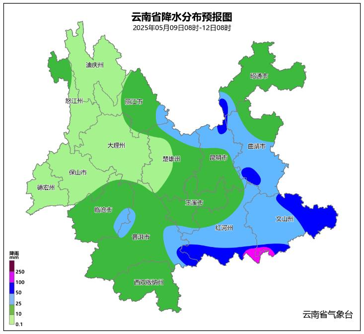 5月9日:昆明市东部、昭通市、曲靖市、文山州有小到中雨局部大雨、暴雨,昆明市西部、玉溪市东部、红河州有阵雨,其他地区晴间多云。