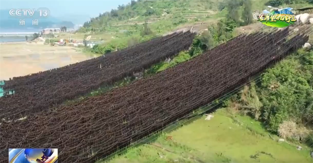 霞浦县依山傍海,当地养殖户巧妙利用地形的高低差,借助电动滑轮将海带从山脚挂至半山腰晾晒。