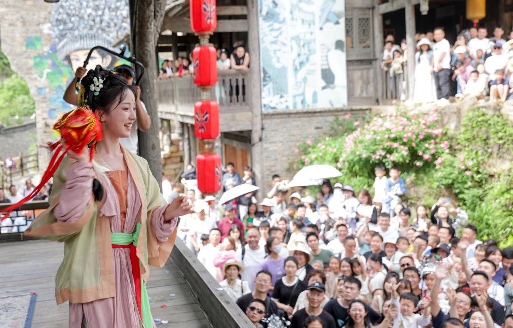 5月1日,在贵州省遵义市乌江寨景区,身着传统服饰的年轻人与游客进行抛绣球互动。新华社发(袁福洪摄)产品上新 创新消费场景