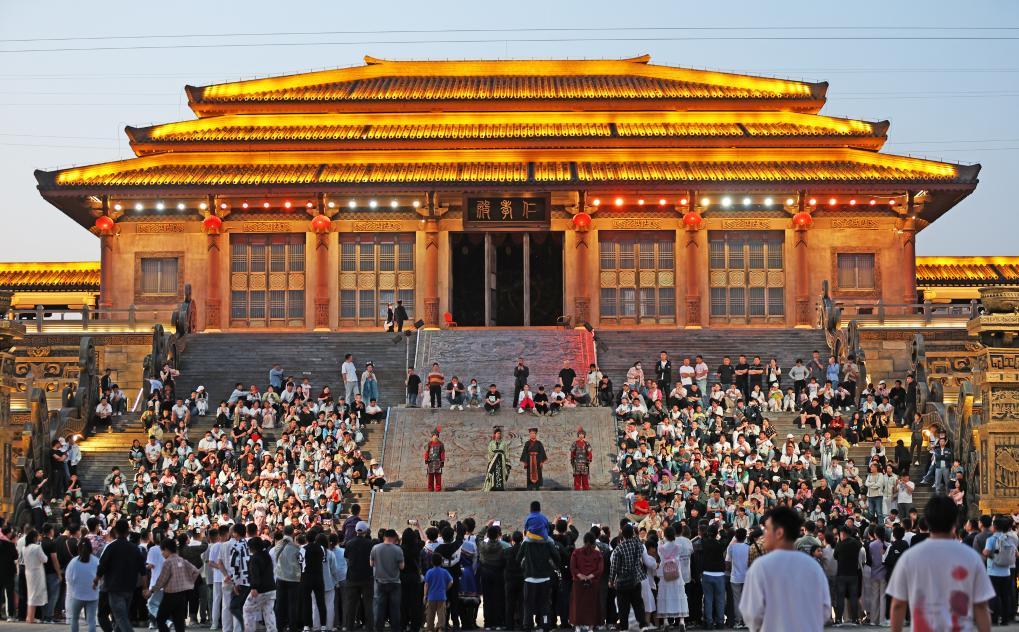 5月1日,游客在山东省临沂市郯城县郯国古城景区观看表演。新华社发(张春雷摄)