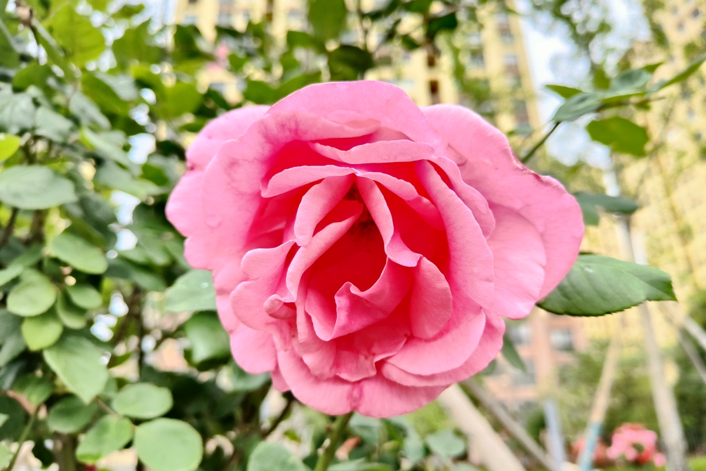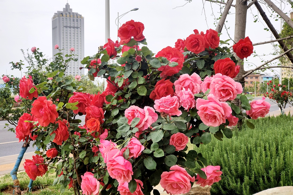 漫步在宣威市的主次干道,一株株高秆月季挺拔而立,枝头缀满的花朵或红似火、或粉如霞,层层叠叠的花瓣在阳光下舒展。盛开的高秆月季与周边绿植相互映衬,形成错落有致、色彩斑斓的立体景观,这充满生机与浪漫的城市美景引得市民纷纷驻足观赏。