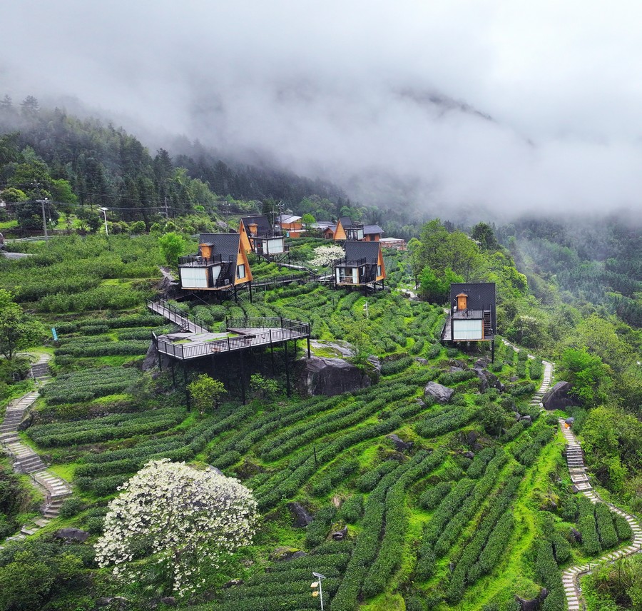 位于上犹县梅水乡的九曲龙溪谷,茶山叠翠间,圆形木屋如明月栖枝,茶叶形建筑似新芽初绽。负责人蓝峰指着初具规模的建筑群介绍说:“这里将成为一个让都市人重拾童真的秘境。”童话树屋、无动力乐园、茶田氧吧……这些设计不是在改造自然,而是在唤醒人与自然最原始的联结。