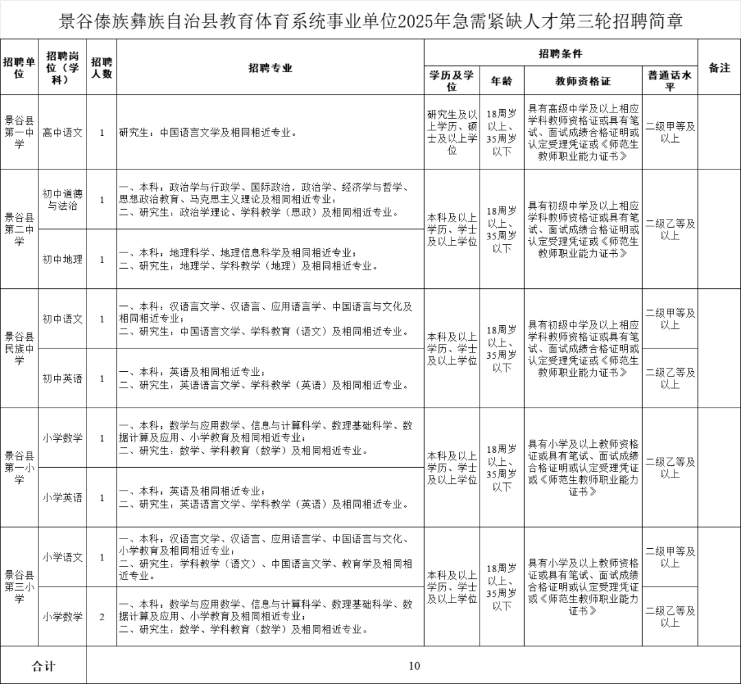 普洱市景谷傣族彝族自治县教育体育系统事业单位2025年急需紧缺人才第三轮招聘公告