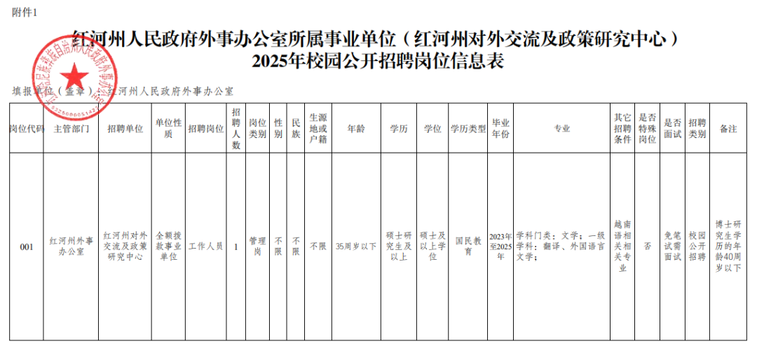 红河哈尼族彝族自治州人民政府外事办公室所属事业单位(红河州对外交流及政策研究中心)2025年校园公开招聘公告