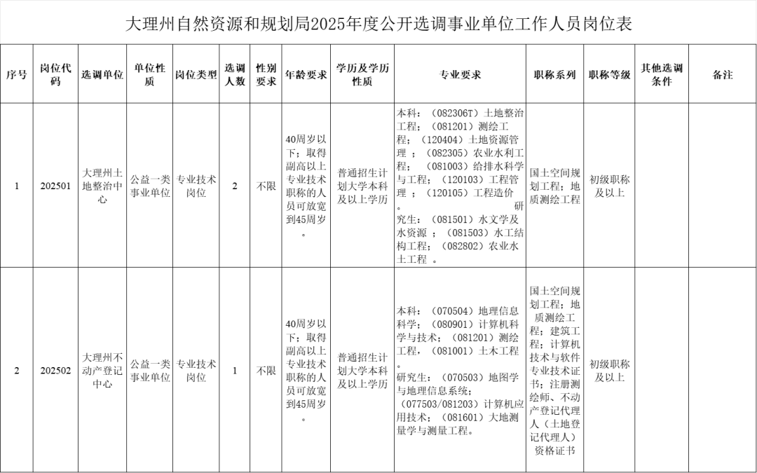 大理白族自治州自然资源和规划局2025年度公开选调事业单位工作人员公告