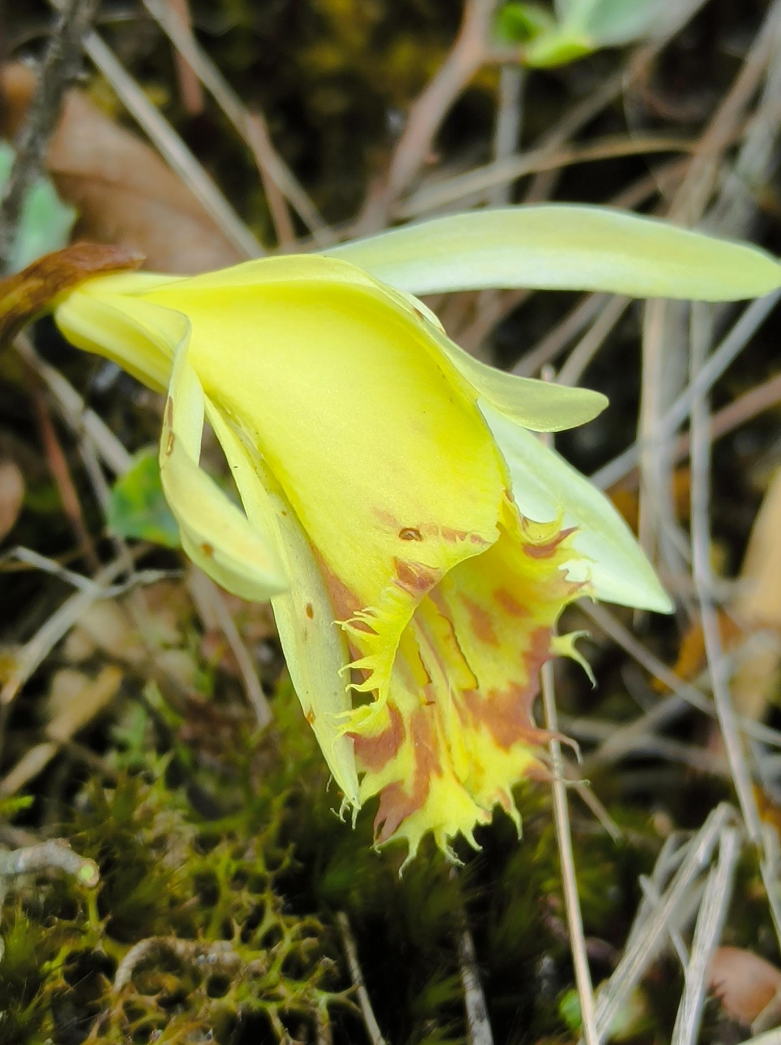 黄花独蒜兰为兰科独蒜兰属附生草本植物,一般生于疏林下或林缘腐殖质丰富的岩石上,也见于岩壁和树干上,生长海拔2200至3100米,花期为4至5月。其形态特征为:顶端1枚叶,叶在花后出现;花苞片长圆状披针形或披针形,花黄色、淡黄色或黄白色,花瓣镰刀状倒披针形;唇瓣宽倒卵状椭圆形或近宽菱形,唇盘上具5至7条褶片。
