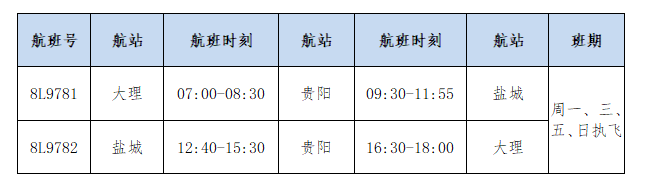 祥鹏航大理=贵阳=盐城航线,周一、三、五、日往返执飞一班。去程航班号8L9781,计划07:00自大理起飞,08:30到达贵阳,经停后于09:30再次起飞,11:55抵达盐城;返程航班号8L9872,计划12:40自盐城起飞,15:30到达贵阳,经停后于16:30起飞,18:00抵达大理。