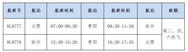 祥鹏航大理=贵阳=徐州航线,周二、四、六往返执飞一班。去程航班号8L9777,计划07:00自大理起飞,08:30到达贵阳,经停后于09:30再次起飞,11:50抵达徐州;返程航班号8L9778,计划12:40自徐州起飞,15:20到达贵阳,经停后于16:20起飞,17:55抵达大理。航班计划以官方渠道实际查询及执行为准。