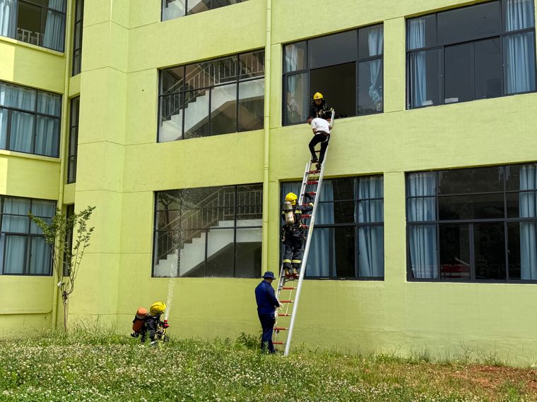 “二楼实训室发现火情,有师生被困!”红色消防车鸣着笛呼啸而至,轮胎与地面摩擦出尖锐的声响。现场还模拟教学楼突发火灾场景,身着防火服的消防员背负空气呼吸器,三人一组迅速将折叠云梯推向墙面,精准卡在二楼阳台护栏。与此同时,白色水带在地面蜿蜒铺开,消防员半跪着将接口拧紧,高压水枪瞬间喷出七八米高的水雾。被困师生在消防员引导下用湿毛巾捂住口鼻,依次登上摇晃的云梯,在消防员环护下缓缓下移至地面。整个演练过程紧张有序、动作规范,达到了预期效果。