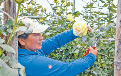 绿叶农场玫瑰种植园内,一名员工正在采摘玫瑰。