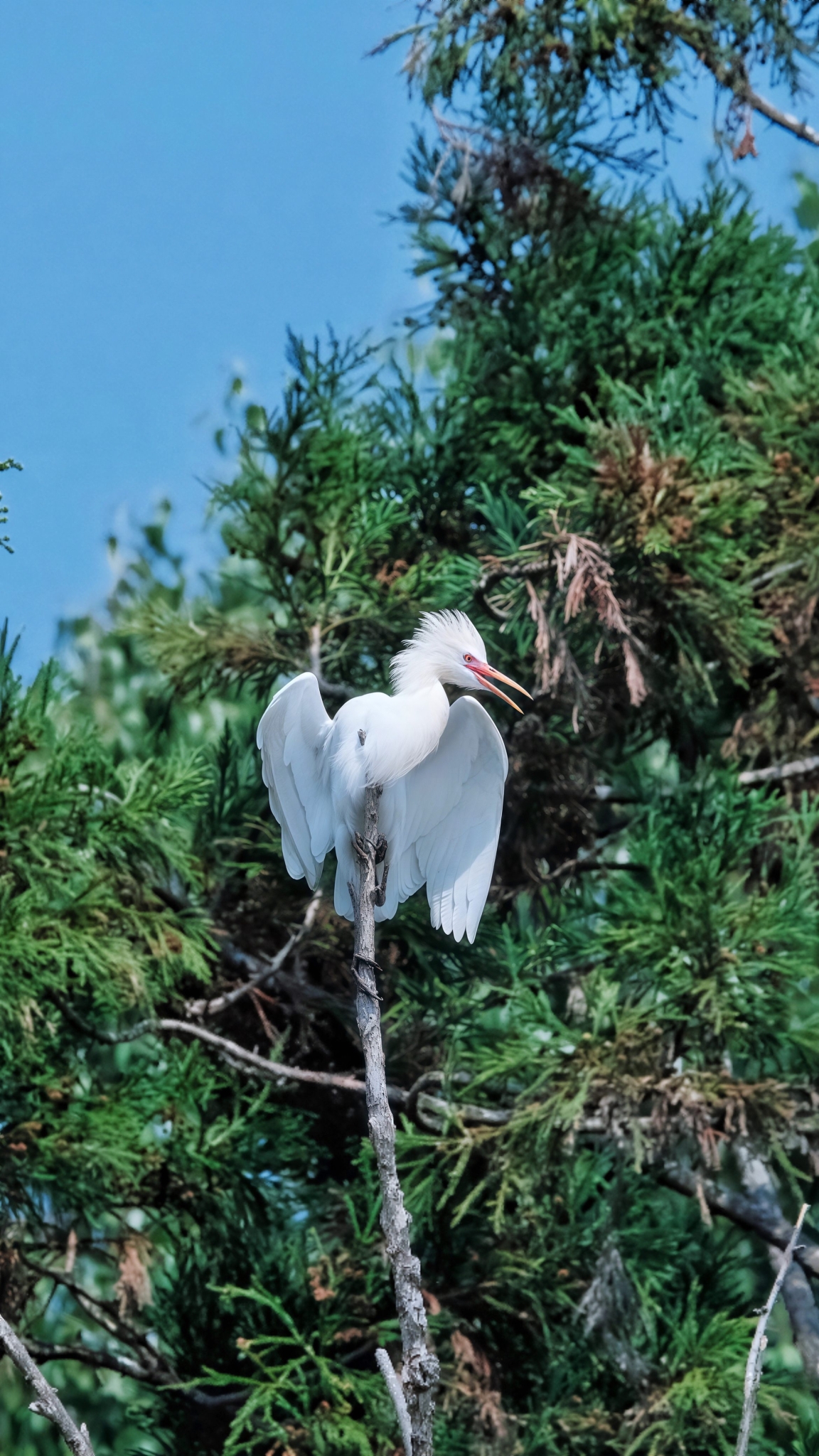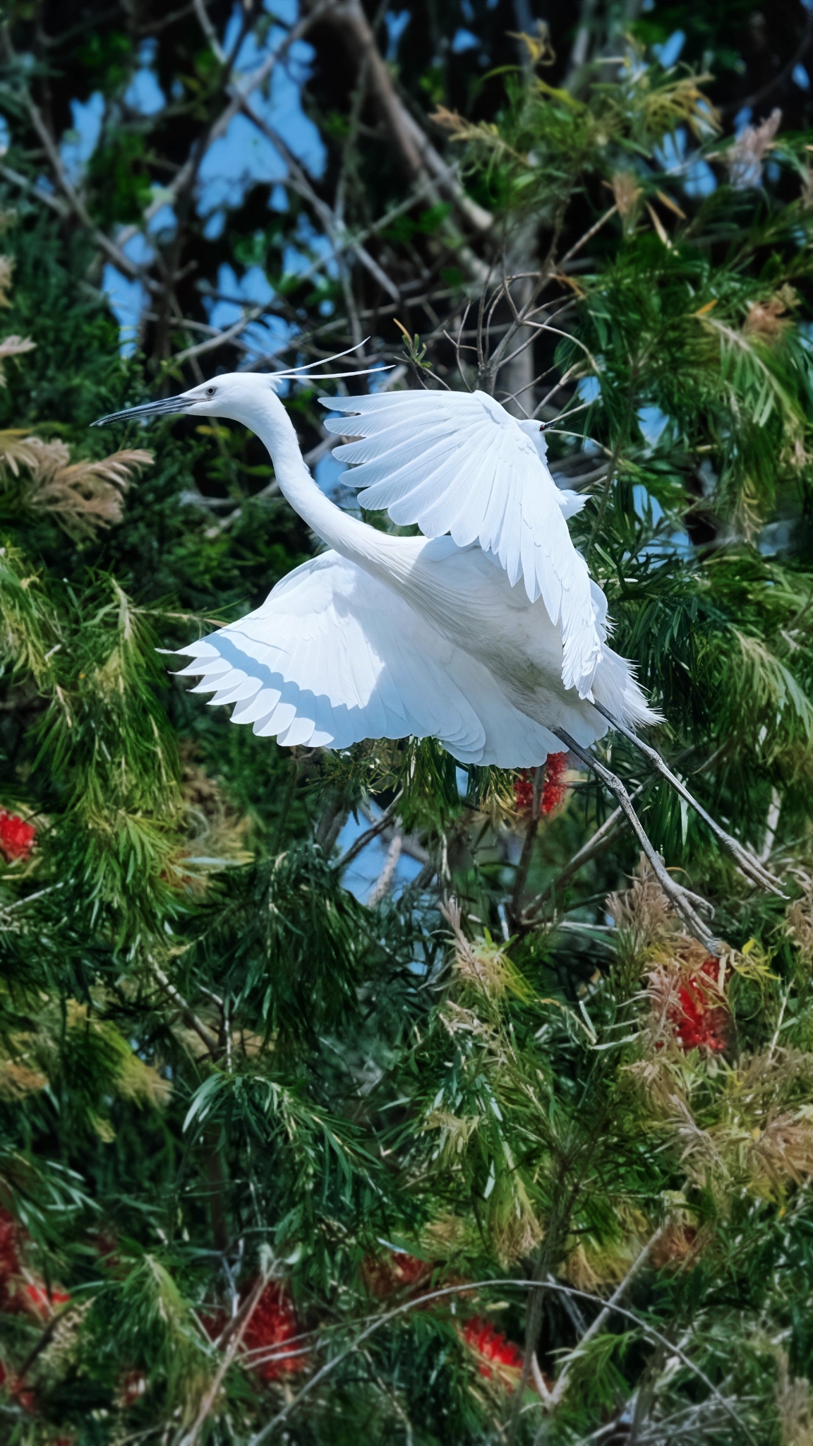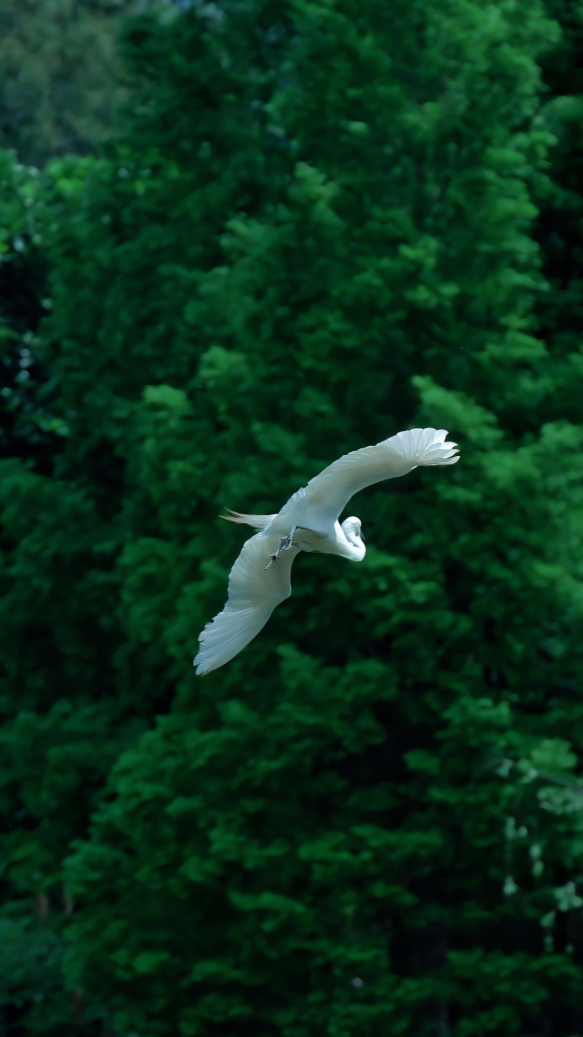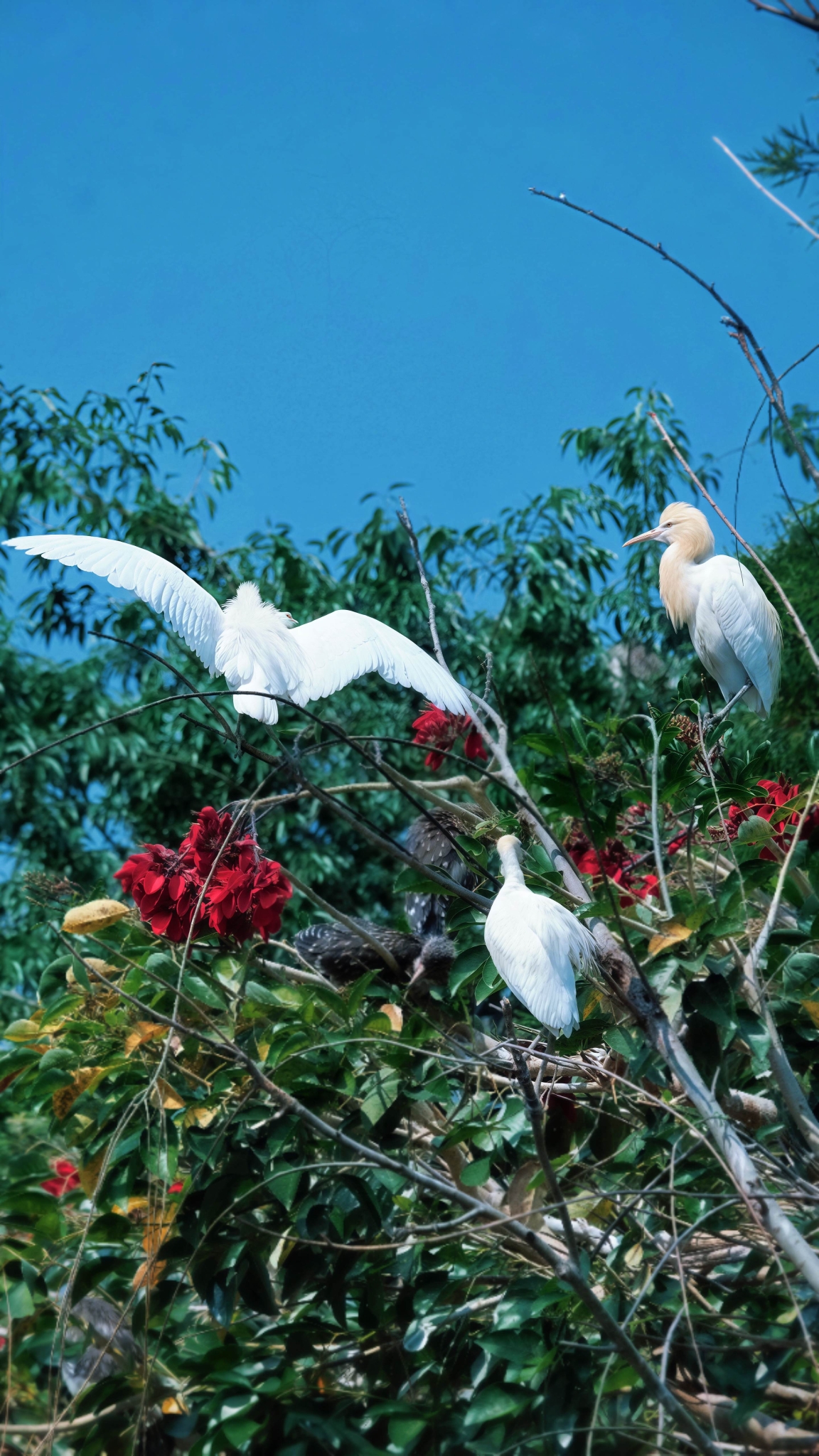 玉龙湖的湖心小岛上聚集着数十只白鹭,它们或悠闲地晒着太阳,或在湖边专注觅食,雪白的羽毛与繁花绿影相衬,显得清逸出尘。一阵风过,白鹭群忽而展翅高飞,在空中盘旋翱翔,为静谧的湖面增添了几分灵动。