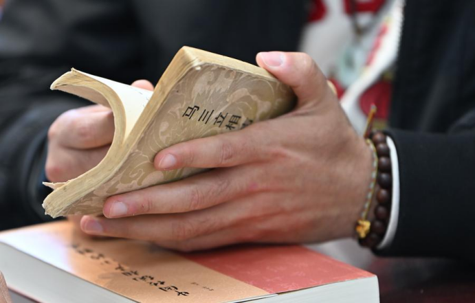 4月24日,在天津市东丽区金桥养老中心(马三立老人院),吴瑞龙翻看《马三立相声选》。