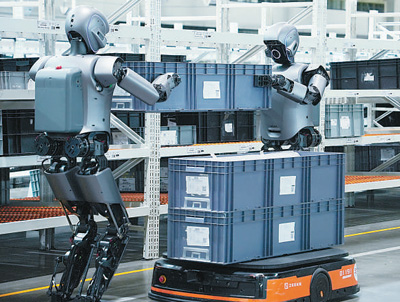 上海首座人形机器人量产工厂——上海智元新创技术有限公司一期工厂近期实现大规模量产。该企业共推出5款机器人,涵盖多个领域。图为工程师在训练人形机器人采集货架信息。