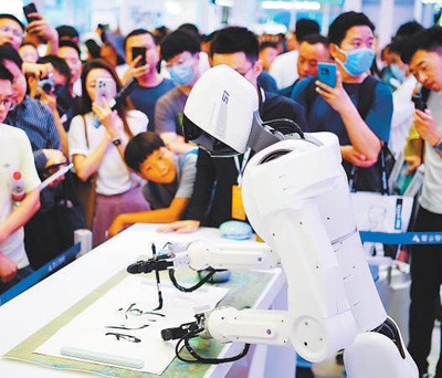 世界机器人大会上,星尘智能机器人S1用毛笔书写“北京”字样。