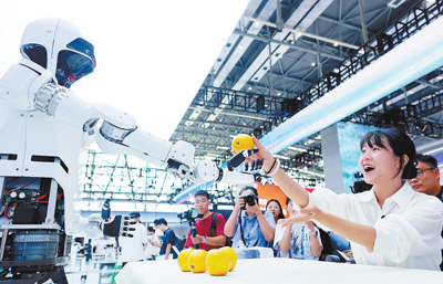 世界制造业大会上,人形机器人“启江二号”与观众互动。“启江二号”配备多个视觉感知传感器、高精度惯性测量单元和高精度六维力传感器,可以完成人类四肢能够做到的一些基本动作。