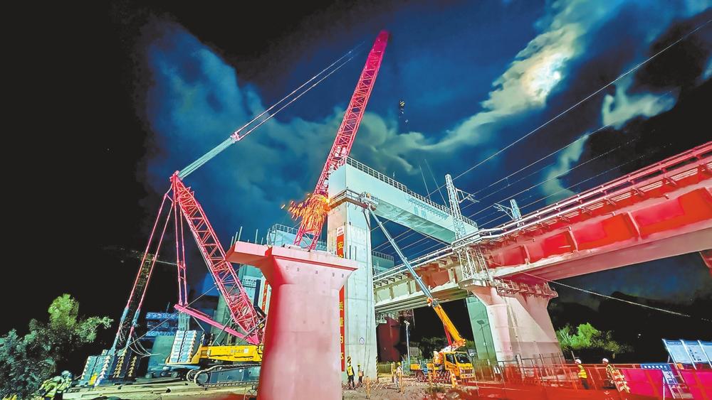 5月13日0时30分,大理铁路枢纽工程关凤大道双线特大桥第五段门式墩钢盖梁的吊装作业正式开始。该桥为全线控制性工程,建设过程中需分次跨越昆楚大铁路。为确保既有铁路线安全运营与施工建设同步推进,中铁十二局大攀铁路项目建设团队采用预制化施工方案,通过工厂化生产、模块化运输、精准化吊装的施工模式,利用5个夜间列车运行间隙,将5段重量分别为185吨、长达33.6米的钢盖梁安全架设到位。