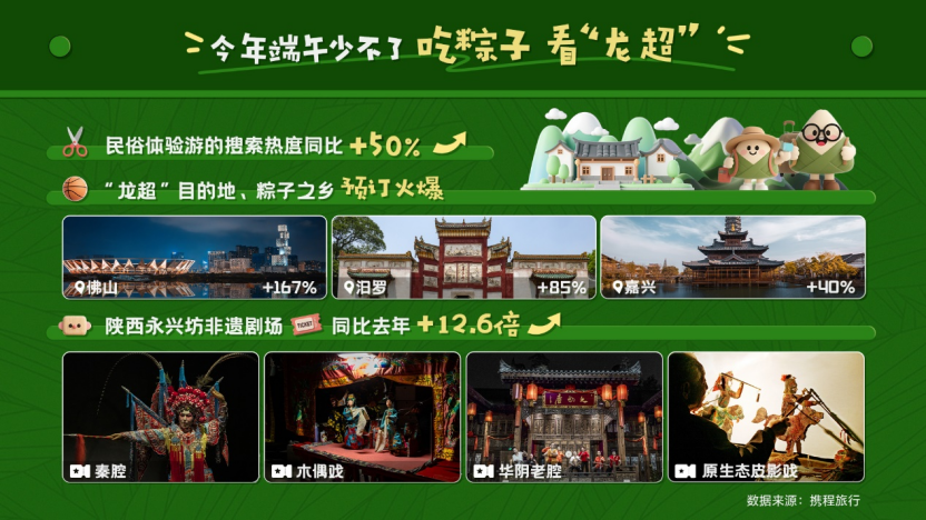 端午作为传统节日,民俗体验游依旧是游客的不二之选,游客热衷于参与各地的赛龙舟、包粽子、佩香囊等活动。携程数据显示,端午民俗体验游的搜索热度同比增长50%。凭借“飙”上央视的叠滘龙船,佛山的旅游订单量、酒店订单量、机票订单量同比分别增长167%、145%和110%;屈原故里湖南汨罗、粽子之乡浙江嘉兴也迎来旅游预订热潮,汨罗的旅游预订订单量、酒店预订订单量同比分别增长85%、88%,嘉兴的旅游预订订单量、酒店预订订单量同比分别增长40%、63%。