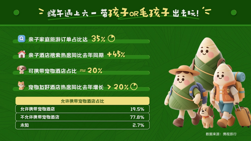 今年端午假期恰好“撞期”儿童节,亲子出游比例大幅攀升。携程平台上,亲子家庭旅游订单占比达35%,国内亲子酒店搜索热度同比上升45%。除了带娃过“六一”,“它”经济在端午出游市场展现巨大潜力。携程酒店数据显示,端午假期,宠物友好酒店热度同比增长超过20%,可携带宠物酒店占比近20%,且相较普通酒店,宠物友好酒店平均房价溢价近30%,折射情感附加值对旅游消费的撬动效应。