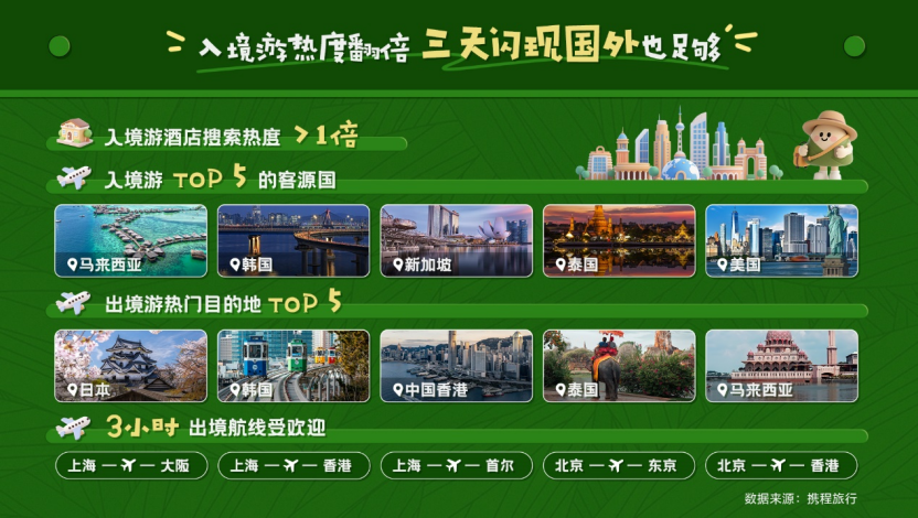 入境游方面,携程数据显示,今年端午假期,入境游酒店搜索热度超1倍,再次凸显China Travel对海外游客的吸引力。入境游目的地城市前10位为上海、北京、广州、成都、重庆、深圳、杭州、昆明、青岛、西安。入境游客源国前10位为马来西亚、韩国、新加坡、泰国、美国、俄罗斯、日本、英国、澳大利亚、法国。