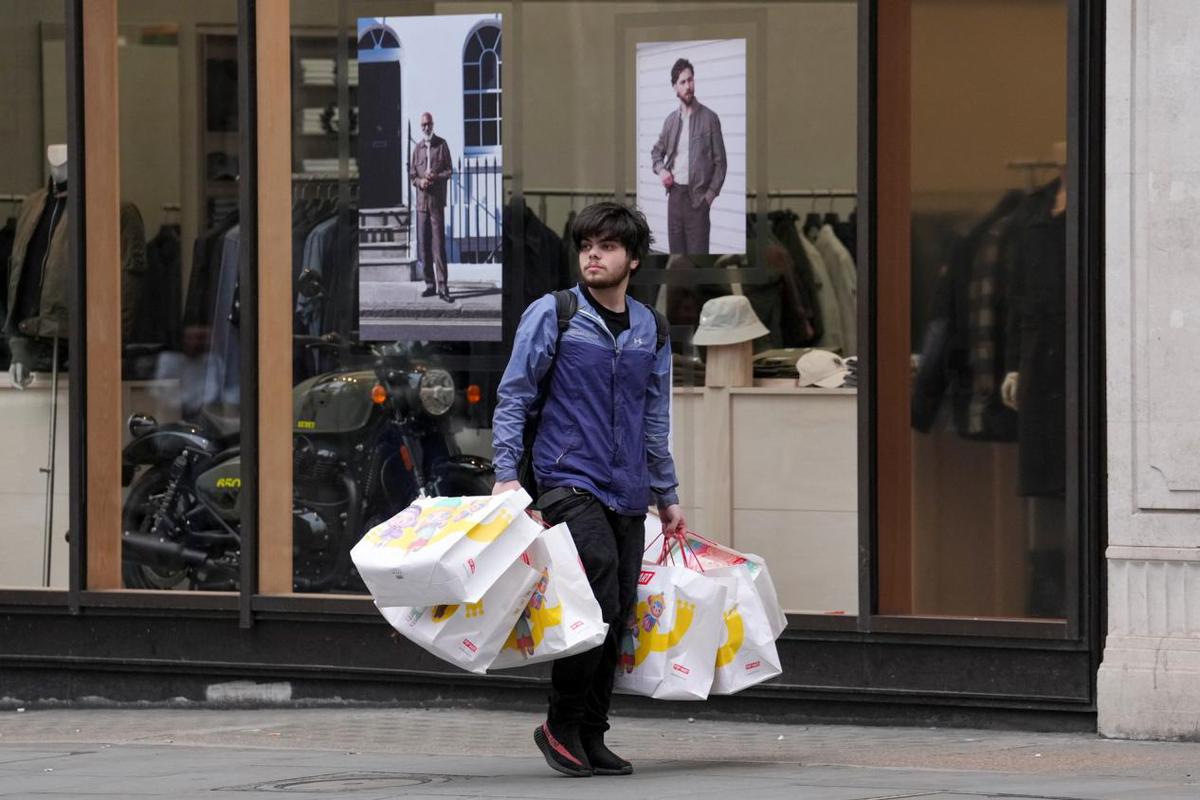 当地时间5月15日,英国伦敦摄政街,一位消费者提着多个装满泡泡玛特的袋子。(图片来源:路透社)