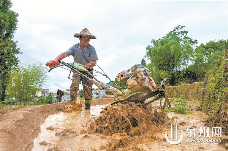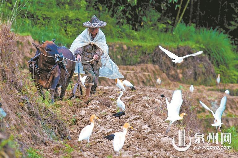 此时,勤劳的农民们正抢抓雨水充沛的有利时机,穿梭在波光粼粼的梯田中,手持农具耙田、注水,田间地头一派热火朝天的劳作景象。