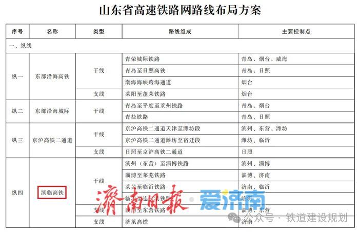 “八纵六横”高速(城际)铁路网中的“纵四”即滨临高铁,包括滨州(东营)至淄博、淄博至莱芜、莱芜至临沂和临沂至连云港4条干线铁路。